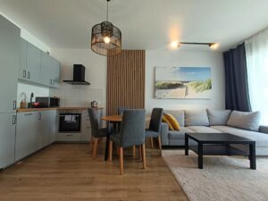 Nowoczesny apartament z prywatną sauną w sercu Władysławowa – idealny na relaks nad Bałtykiem! Na 44 m² znajdziesz przestronną sypialnię z dużym łóżkiem małżeńskim, komfortowy salon z TV i wygodną sofą oraz w pełni wyposażony aneks kuchenny (zmywarka, piekarnik, lodówka, garnki, talerze – wszystko jak w domu). W łazience czeka na Ciebie prywatna, przestronna sauna – idealna na 4 osoby, z profesjonalnym piecem. Do dyspozycji także duży balkon, część jadalniana i pojemna szafa z pralką w przedpokoju. Apartament łączy komfort domowego wnętrza z luksusem strefy spa. Blisko plaża, atrakcje i restauracje. Idealny na romantyczny wyjazd, rodzinne wakacje lub weekendowy reset!