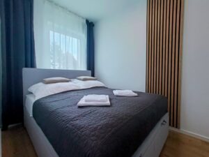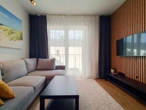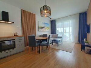 Ten dwupokojowy apartament zachwyca funkcjonalnością i designem. Jasny salon łączy w sobie w pełni wyposażony aneks kuchenny i wygodną kanapę, która zamienia się w łóżko dla dwóch osób. Wyjście na balkon pozwala cieszyć się świeżym powietrzem i widokiem na otoczenie.